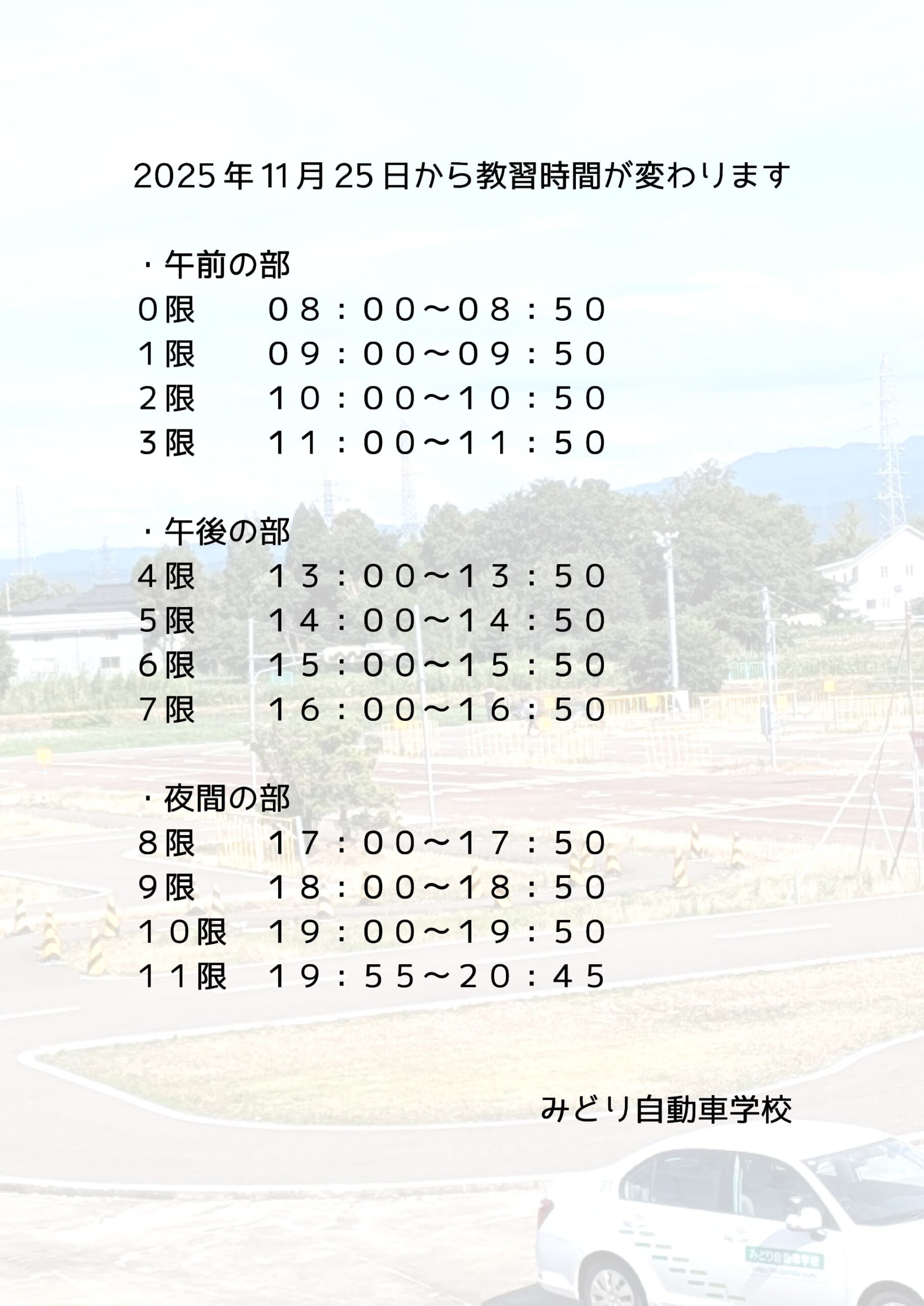 教習時間変更のお知らせ 2025年11月25日(火)より、教習時間を下記の通り変更いたします。 新しい教習時間は、以下の画像をご確認ください。 サイト開発者2025-11-25T10:52:39+09:00